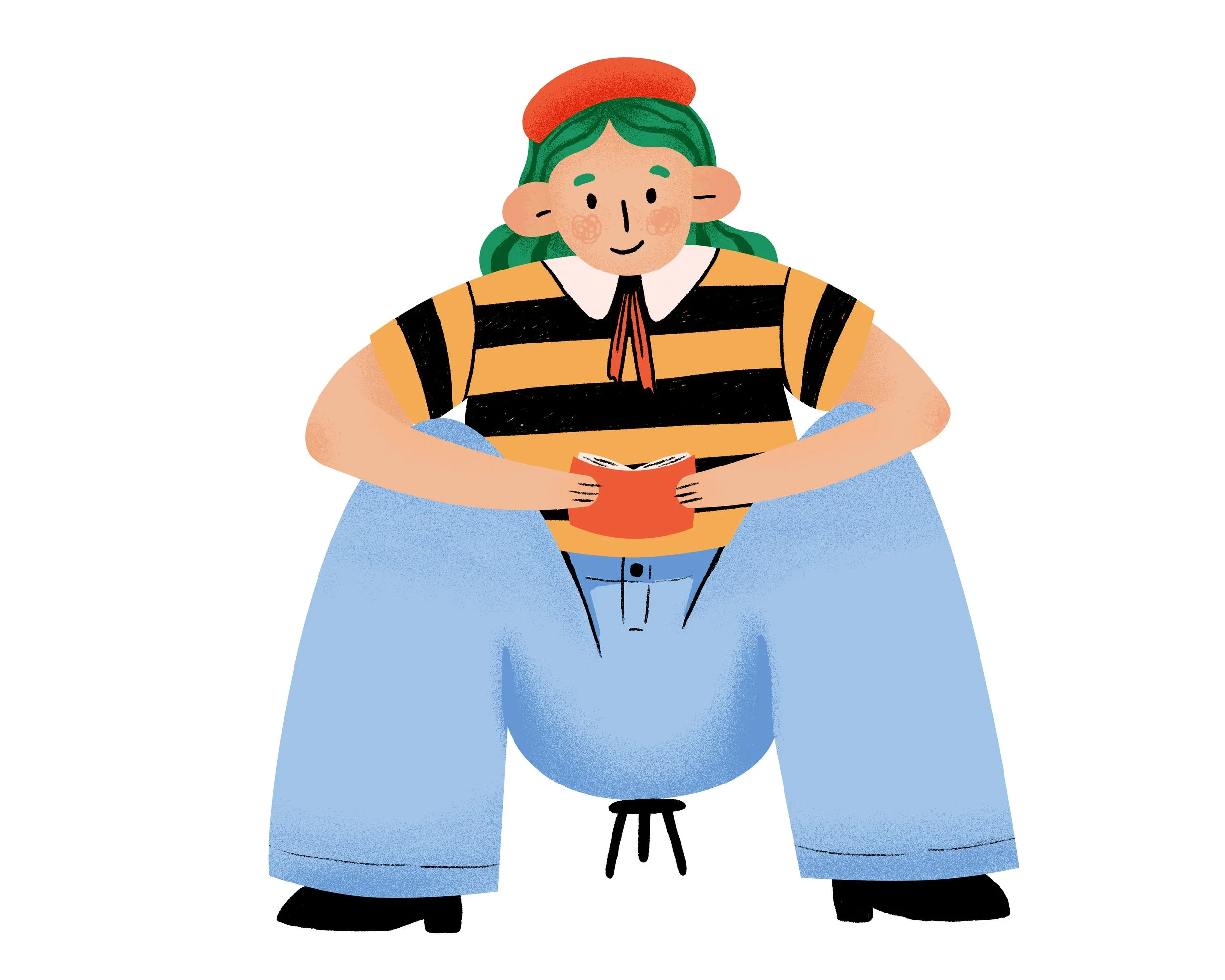 Working through each of the exercises, I experimented with proportion, gesture, and shape until I landed on a character I really enjoyed: a whimsical lady holding a book. I then took her from sketch to final illustration, layering in bold shapes, playful details, and bright colors.